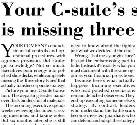 Your next leadership transition deserves better than polished slide decks. It requires origin stories that create ownership, pattern stories that transfer mental models, and diagnostic stories that sustain urgency. Document these with the same rigor you apply to financial controls, and your successor won’t just execute your strategy—they’ll defend and evolve it.