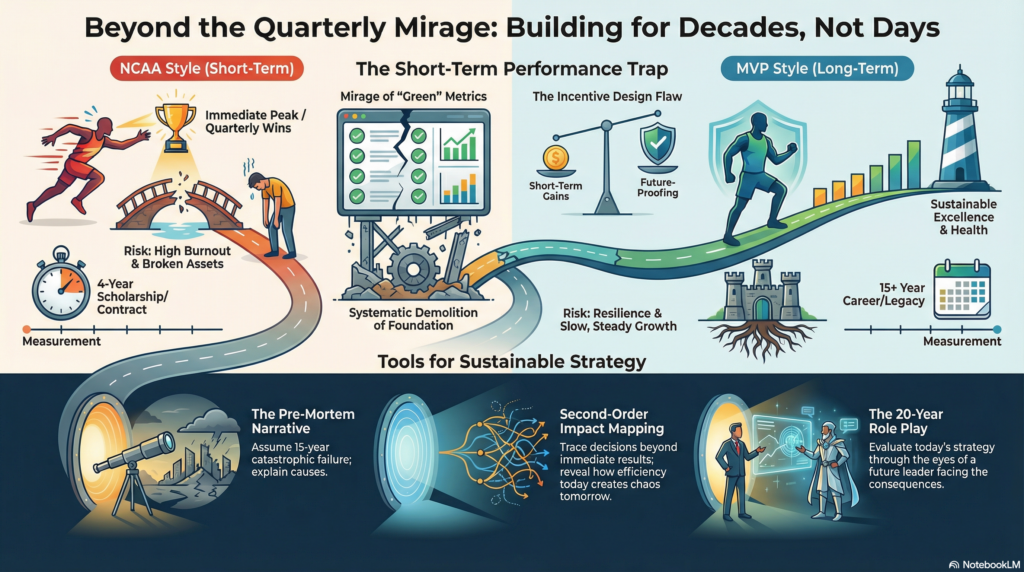 - “Analyze my industry through the NCAA vs MVP lens. Who in my competitive landscape is running the short-term optimization playbook? Who’s building for decades? What specific metrics distinguish them? What would it cost me to switch approaches?”